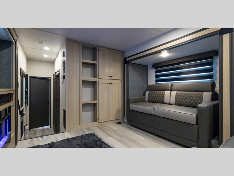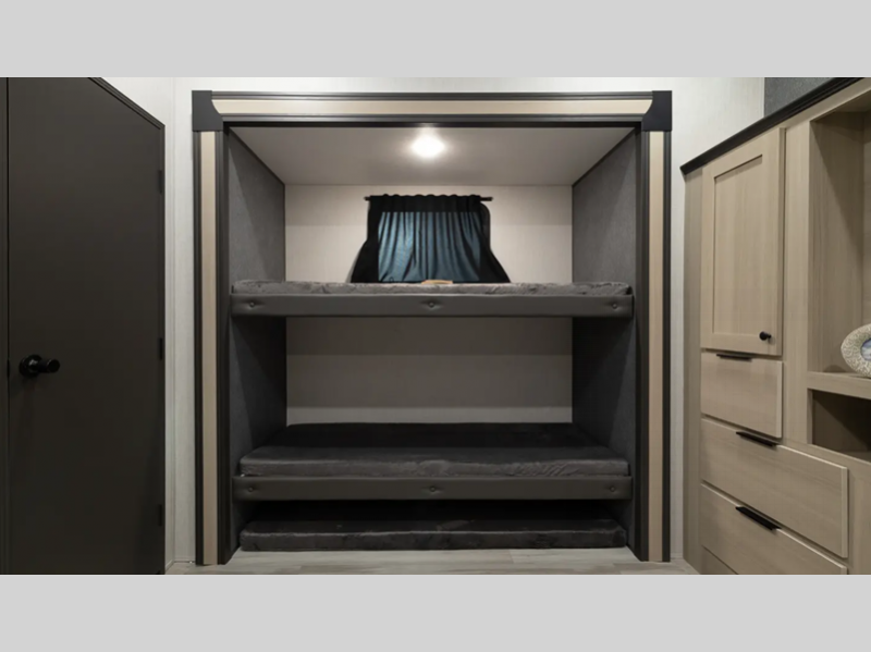 Sleeps 5 Slides 4 Length 43 ft 3 in Ext Width 8 ft Ext Height 13 ft 6 in Hitch Weight 2150 lbs GVWR 14908 lbs Dry Weight 12208 lbs Cargo Capacity 2700 lbs Fresh Water Capacity 60 gals Grey Water Capacity 114 gals Black Water Capacity 76 gals Furnace BTU 35000 btu Number Of Bunks 3 Available Beds King Refrigerator Type 12V Refrigerator Size 16 cu ft Number of Awnings 1 LP Tank Capacity 20 lbs Water Heater Type On Demand Tankless AC BTU 18000 btu TV Info LR LED TV Awning Info 19' Power Axle Count 2 Washer/Dryer Available Yes Number of LP Tanks 2 Shower Type Standard Electrical Service 50 amp Similar Floorplans