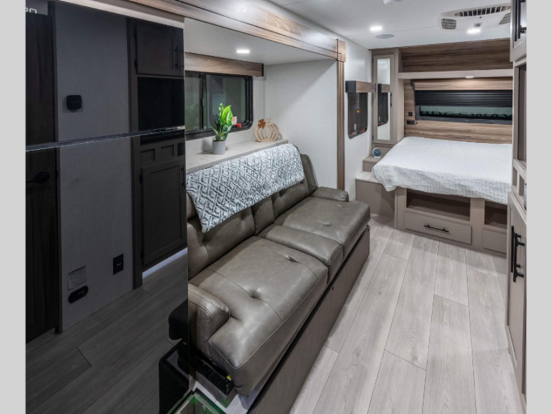 Some of the top features you'll enjoy are the molded fiberglass front cap with a windshield, the fully walkable roof with a ladder, and the exterior docking station. There is also a Key Alike program for the baggage and entry doors to keep your belongings secure plus flip-up entry steps, a Leash Latch with a bonus beverage opener, and more exterior conveniences. The seamless countertops inside will be easy to keep clean and the painted hardwood cabinet doors will make your space feel like home.