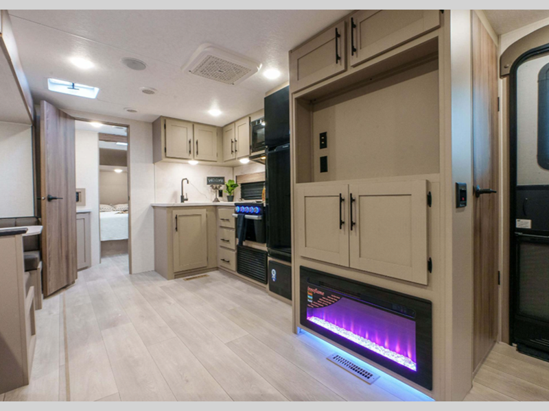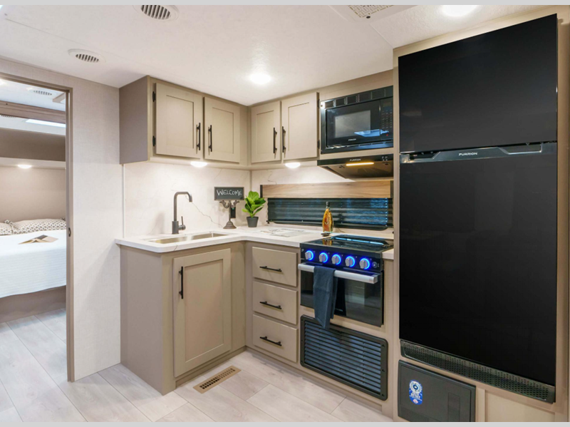 Sleeps 3 Slides 1 Ext Width 8 ft Ext Height 10 ft 10 in Int Height 6 ft 6 in Interior Color Chocolate Fresh Water Capacity 45 gals Grey Water Capacity 64 gals Black Water Capacity 32 gals Tire Size 15" Furnace BTU 30000 btu Available Beds Queen Refrigerator Type 12V Refrigerator Size 10 cu ft Cooktop Burners 3 Shower Size 30" x 36" Number of Awnings 1 LP Tank Capacity 20 lbs Water Heater Type On Demand Tankless AC BTU 13500 btu Awning Info 19' Power w/LED Light Strip Axle Count 2 Number of LP Tanks 2 Shower Type Standard Electrical Service 30 amp Similar Floorplans